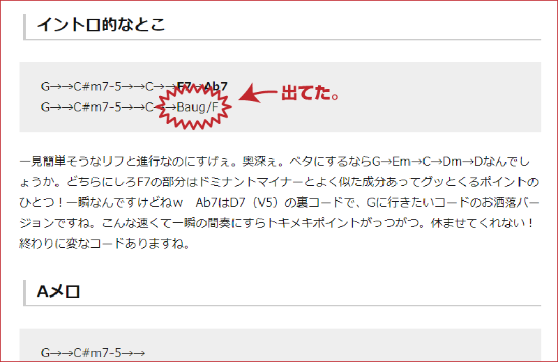 いやね、サビ"前"とか、AメロBメロ"前"とかじゃたまに見るんですよ、あれ?そういや今回どっかで見ましたね、ちょっとアタマのAメロから間奏(イントロ的な)のところ振り返ってみます。